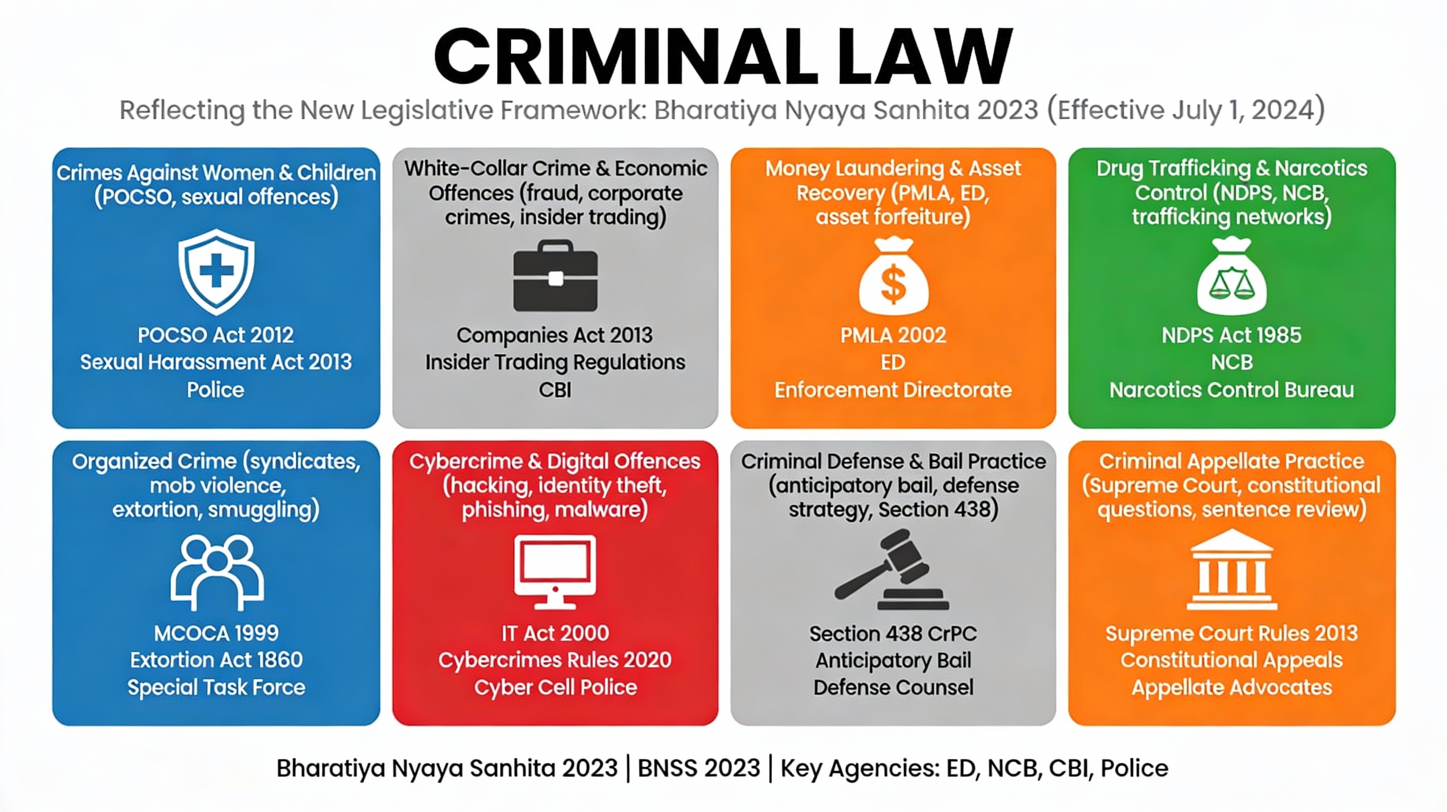 Criminal law practice requires mastery of substantive crime definitions, procedural regulations, constitutional protections, and strategic advocacy skills. The July 2024 implementation of India's reformed criminal laws presents significant opportunities for practitioners willing to invest in understanding new frameworks, modernized procedures, and technology-integrated investigation and evidence standards. The practice areas span from protecting society's most vulnerable members (children, women) through sexual offence prosecution, to constraining organized crime through sophisticated asset recovery mechanisms, to defending individuals' constitutional rights against state power.
