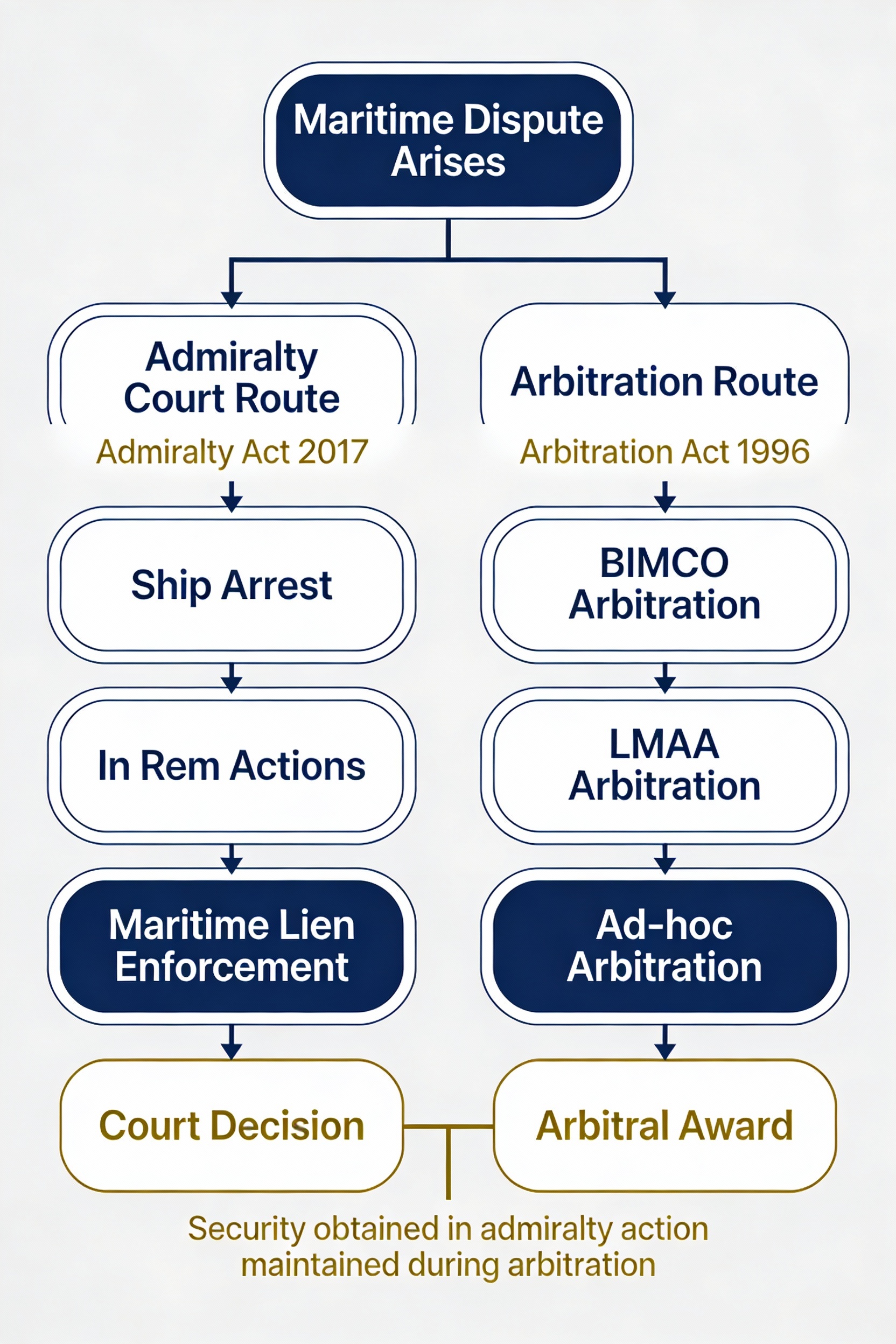 This flowchart illustrates the dual-pathway dispute resolution mechanism under Indian law, demonstrating how maritime disputes can be resolved through either admiralty courts or arbitration, with important interactions between both systems.