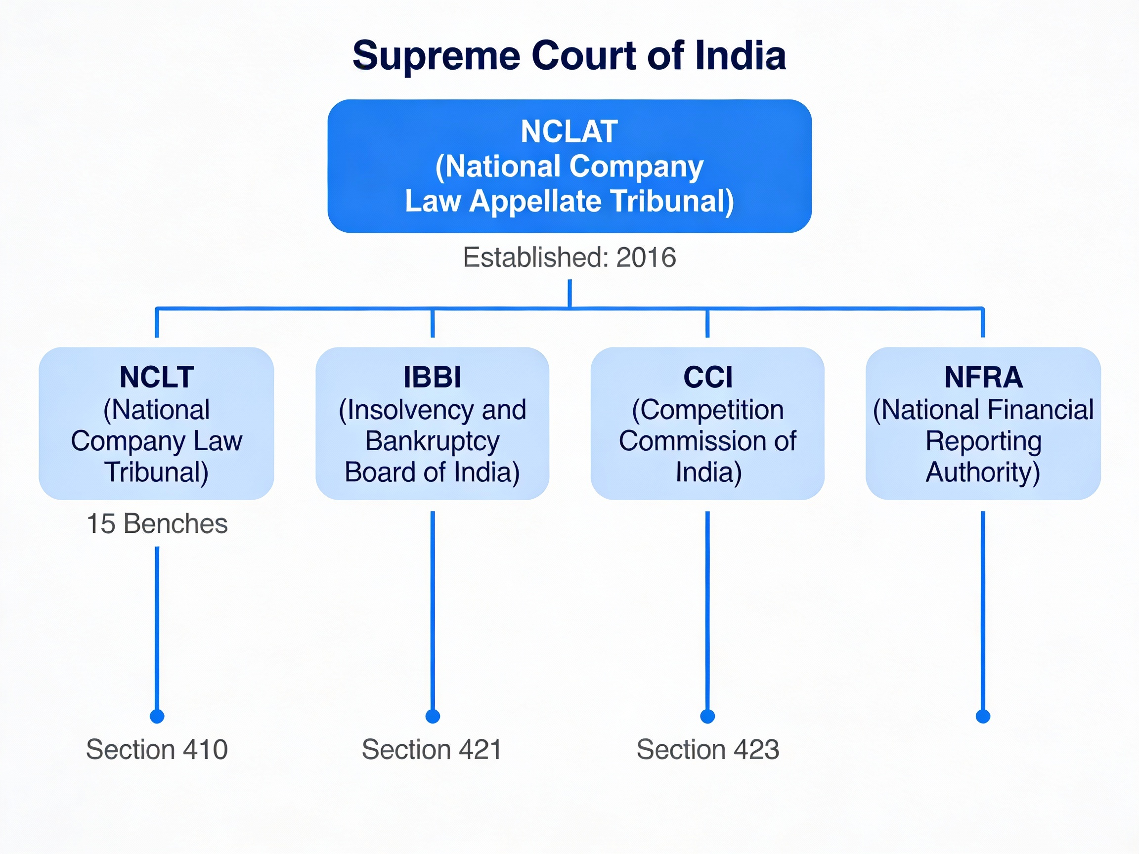 The National Company Law Appellate Tribunal (NCLAT) is a specialized appellate body established under Section 410 of the Companies Act, 2013, constituted by the Central Government with effect from 1st June, 2016. It serves as the primary appellate forum for reviewing decisions of the National Company Law Tribunal (NCLT) and certain other quasi-judicial authorities in India's corporate dispute resolution system.
