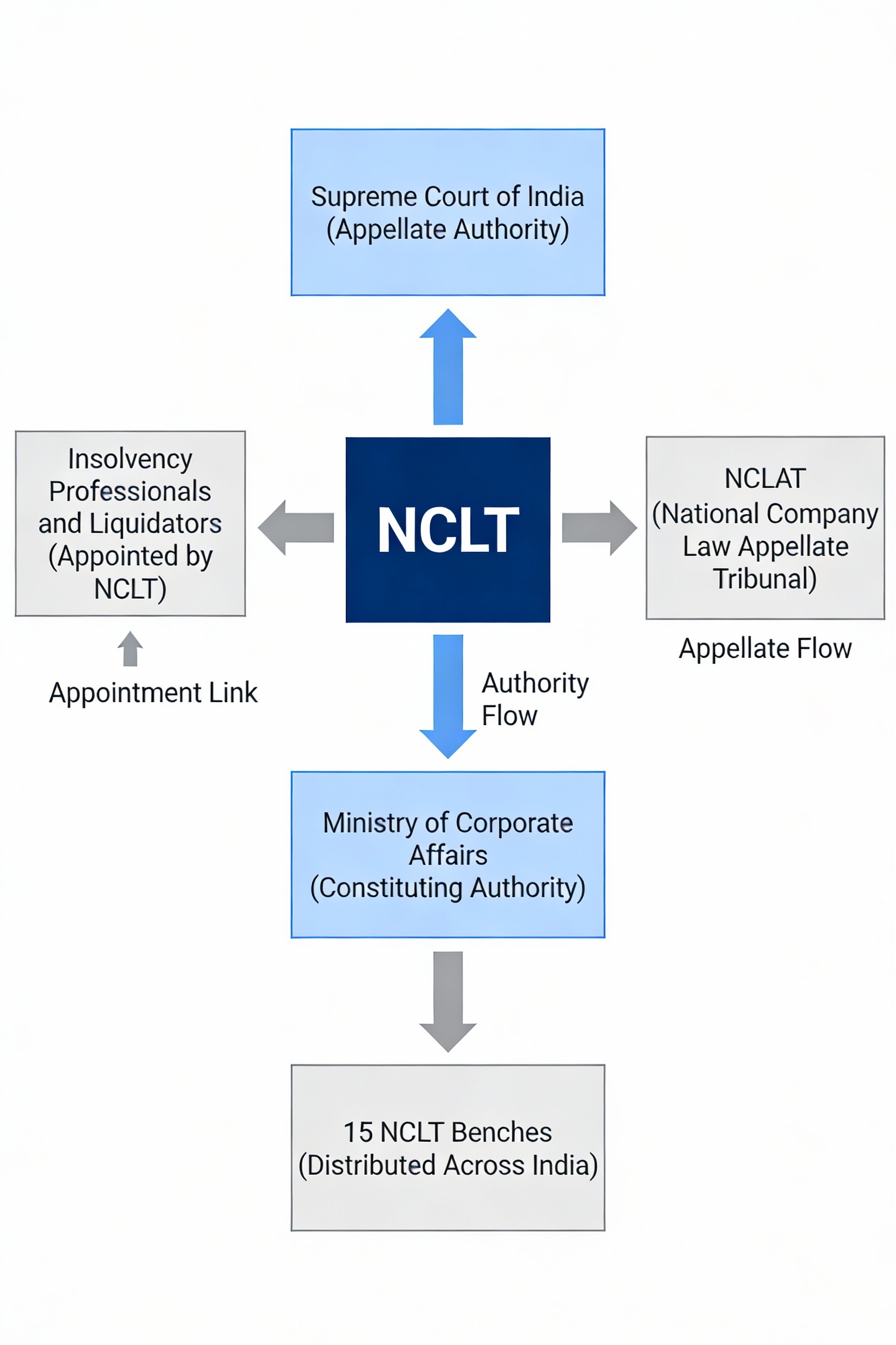 The NCLT operates under the Ministry of Corporate Affairs, with appeals directed to the National Company Law Appellate Tribunal (NCLAT) and further appeals to the Supreme Court. The tribunal coordinates with Registrars of Companies, SEBI, Insolvency Professionals, and Liquidators appointed in various proceedings.